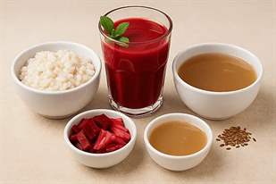 Состав (пример): свекольный сок, сок квашеной капусты, настой мяты, ложка льняного масла. Употребляется натощак в тёплом виде.